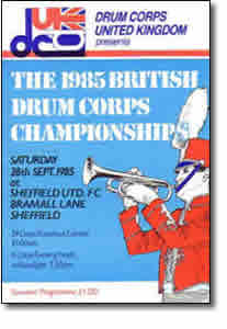 On Saturday, 28th September 1985 over 2000 young people will meet at Sheffield United Football Club, Bramall Lane, Sheffield for the annual British Drum Corps Championships. The climax of this summer's drum corps season will see 25 units from many parts of England and Scotland compete for the British Championship. A large crowd will experience a feast of sound and colour with the big band sound of the brass and percussion being complemented by the flags of the colour guard and complicated marching routines tot give a total audio visual effect. An all day preliminary knockout contest will end with a floodlight evening finals commencing at 7.15pm. The end of a day which presents everything of value in today's yound people.