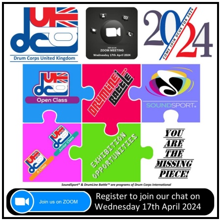 DCUK will be holding an on-line ZOOM "meeting" on WEDNESDAY 17th APRIL 2024 at 8pm, with representatives from our activity in attendance, to give an opportunity for ANY performing unit, that might be interested in any of what DCUK can offer, to just have a chat, with no obligation, and see what might be suitable to your group! This includes potential opportunities in 2025 during the winter season to perform your show indoors at a WGUK contest - so just come and chat and see if what we are offering fits with your current schedules and plans.